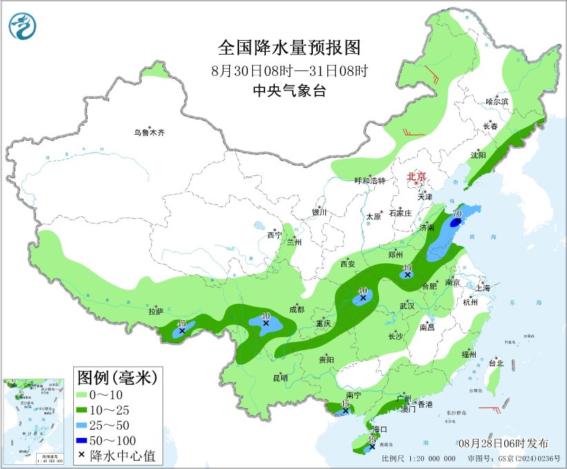 预计,8月28日08时至29日08时,吉林东部、辽宁中东部、西藏东南部、甘肃东部和南部、陕西中南部、山东中北部、河南西部、湖北西北部、川西高原、四川盆地西部和南部、云南东北部、广东中西部等地部分地区有大到暴雨,其中,四川盆地西部、广东西南部沿海等地局地有大暴雨(100~200毫米)。上述部分地区伴有短时强降水(最大小时降雨量20~50毫米,局地可超过70毫米),局地有雷暴大风等强对流天气。中央气象台8月28日06时发布暴雨蓝色预警。
