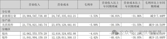 数据显示,1-6月间,作为晶澳科技绝对主力(营收占比91.10%)的光伏组件产品,虽实现了217.77亿元的营业收入,但其毛利率却降至-5.98%,同比减少10.51个百分点,低于公司整体(-3.53%)的毛利率水平。