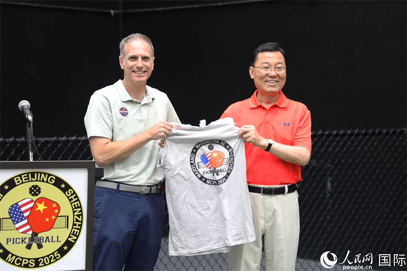 此次友谊赛是2025中国青少年匹克球人文交流美国行的系列活动之一。中美青少年混编分组,在匹克球场共赴青春之约、书写友谊新篇。今年4月,马里兰州青少年匹克球交流团成功访华,与中国青少年结下友谊。此次,来自中国深圳的53名师生访问美国,与美国青少年展开交流活动。