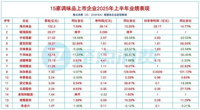 从这15家企业的数据来看,除了海天味业之外,腰部企业(上半年营收在10-30亿元之间)压力普遍较大。