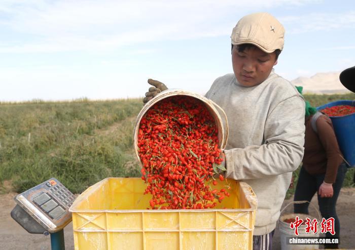9月4日,青海省海西蒙古族藏族自治州格尔木市种植的柴达木枸杞迎来丰收季。图为工人对采摘的枸杞进行称重。张忠苹 摄