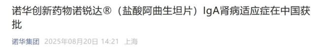 2024年5月,诺华公布了其开发的阿曲生坦治疗IgA肾病患者的Ⅲ期ALIGN研究的预定中期分析结果。2025年4月,阿曲生坦首次获FDA加速批准用于IgA肾病。四个月后,阿曲生坦在中国获批上市,用于降低有疾病进展风险的IgAN成人患者的蛋白尿。这是国内首个获批治疗IgA肾病的非免疫性疗法,也是国内首个且目前唯一针对该适应症的高选择性内皮素A(ETA)受体拮抗剂,有望重塑IgA肾病治疗基石。