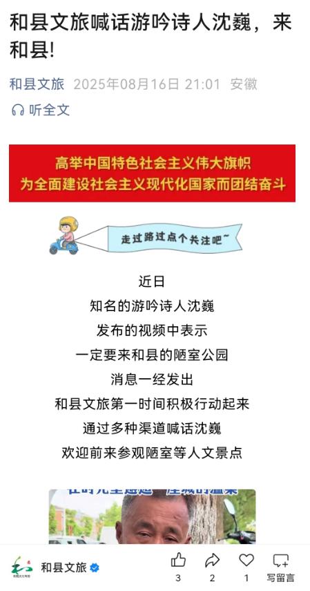 而更为奇怪的是在“和县文旅”公众号上,只字不提沈巍的和县之行,而该公众号在2025年8月16日曾经专门发出一则热情喊话沈巍的旗语:“和县文旅喊话游吟诗人沈巍,来和县!”
