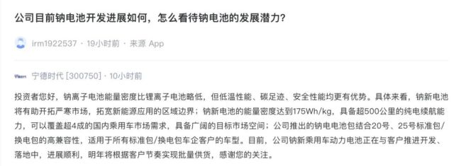另有分析指出,钠电池成本优势也将挤压低端市场。宁德时代在互动平台最新回复显示,钠离子电池能量密度比锂离子电池略低,但低温性能、碳足迹、安全性能均更有优势。公司钠新电池的能量密度达到175Wh/kg,具备超500公里的纯电续航能力,预计明年就将批量供货。