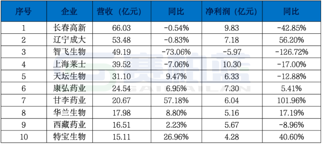 其中,智飞生物作为2024年生物制品行业的龙头企业,2025年营收同比大幅下滑超7成,份额下滑至第三位,受民众接种意愿下降、市场需求变化等多重因素影响,面对结构性转型调整;2025年上半年排在首位的长春高新,和去年同期基本持平,上海莱士排第四位,营收接近40亿元,同比下降7%;其余前十企业均有不同幅度的增长。