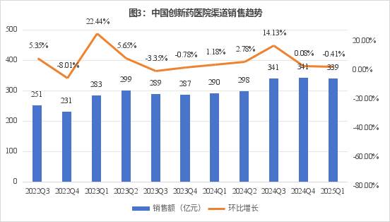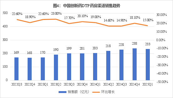 再来看看院外市场的表现。从2022年第三季度到2025年第一季度,DTP药房销售环比增长始终保持在14%以上,大部分季度在18%左右;2022年第三季度、2023年第一季度更是达到22.6%的高增长;2025年第一季度,DTP药房销售额达233亿元,同比增长15.0%,创新药在DTP市场保持双位数增长态势。