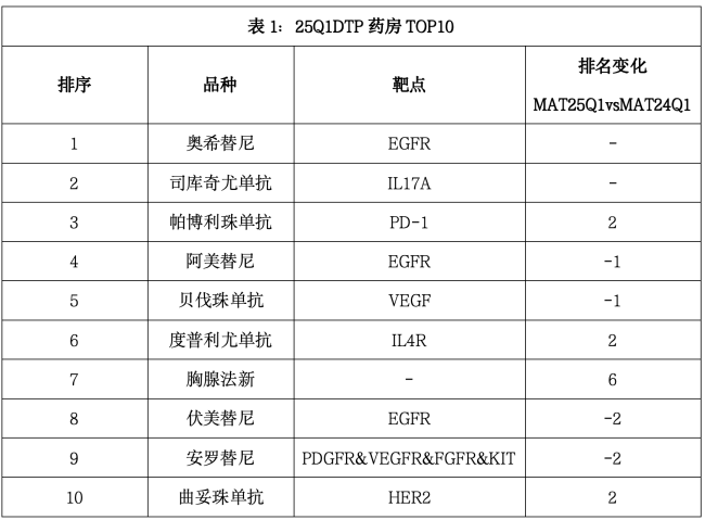 2025年第一季度DTP药房销售TOP10品种中,排名第一的是奥希替尼,EGFR靶点明星产品,主要用于治疗肺癌,保持稳定领先地位;排名第二的是司库奇尤单抗,常用于治疗银屑病等自身免疫性疾病;排名第三的是帕博利珠单抗,相比上一个周期排名上升2位,表现出色;度普利尤单抗和曲妥珠单抗排名也上升了2位;而阿美替尼、贝伐珠单抗、伏美替尼和安罗替尼的排名有所下降;胸腺法新的排名上升幅度最大——上升6位,成为榜单“黑马”。