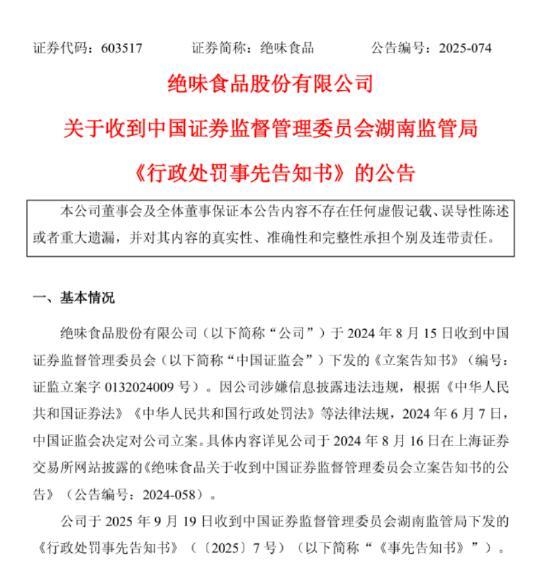 去年6月,证监会因绝味食品涉嫌信息披露违法违规对其立案。历经接近16个月的调查,发现公司在2017年至2021年未确认加盟门店装修业务收入,导致各年度报告营业收入分别少计。湖南证监局责令绝味食品改正并处以罚款,同时对公司董事长兼总经理戴文军等高管给予警告并处以罚款。