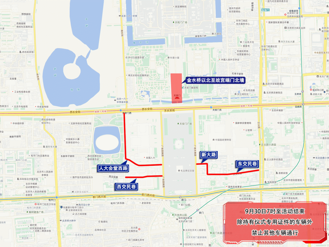 一、9月30日7时至活动结束,人大会堂西路,人大会堂西路与西交民巷交叉口(不含)至西交民巷东口,东交民巷正义路路口(不含)至新大路西口,天安门金水桥以北至故宫端门北墙一线区域,除持有活动专用证件的车辆和人员外,禁止其他车辆和行人通行;