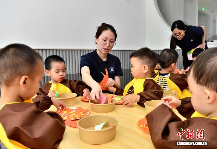 7月29日,福州新星托育园东街园老师指导小朋友进行艺术创想,制作美味的“披萨”。近年来,当地积极推动公办幼儿园和社会力量兴办发展托育教育服务,以解决民众“带娃难”的问题。中新社记者 张斌 摄