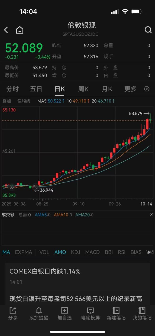 贵金属价格持续上涨,周大福、潮宏基等品牌金饰克价已涨至1215元/克。根据WIND数据,伦敦现货黄金继10月13日大涨2.29%后,10月14日继续刷新历史纪录,达到4150美元/盎司,盘中最高触及4179美元/盎司。伦敦现货白银也在10月13日大涨4.39%,突破52美元/盎司关口,并在10月14日再次上冲,突破53美元/盎司,续创历史新高。