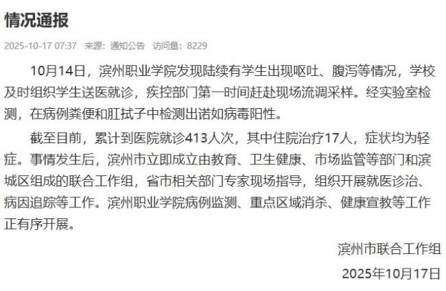 截至目前,共有413名学生到医院就诊,其中17人住院治疗,症状均为轻症。事件发生后,滨州市立即成立了由教育、卫生健康、市场监管等部门及滨城区组成的联合工作组,省市相关部门专家也到场指导,开展了医疗诊治和病因追踪等工作。目前,滨州职业学院正在进行病例监测、重点区域消毒以及健康宣传教育等措施。