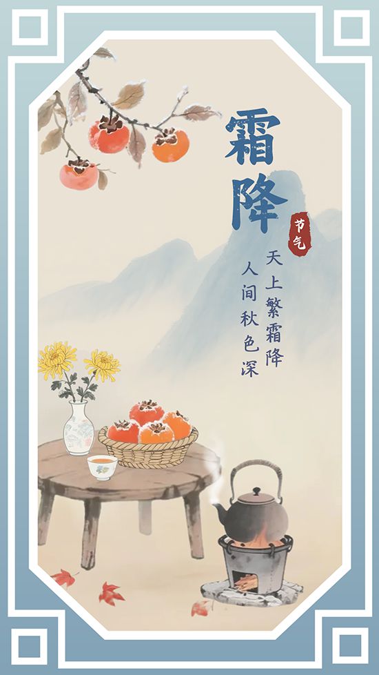 天气越发寒冷,正是进补的时节,民间有“一年补透透,不如补霜降”的说法。北方人喜欢吃牛肉御寒,而闽南一带则喜欢吃鸭肉进补。民间还有霜降时节吃柿子的习俗,这个时候,柿子个大、皮薄、汁甜,正是食用的最佳时期,霜降吃柿子也有“好事成双”的美好寓意。