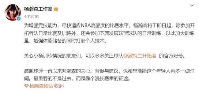 杨瀚森工作室随后更新社交媒体表示,为了增强竞技能力和尽快适应NBA高强度的比赛水平,杨瀚森除了参加开拓者队的日常比赛及训练外,还会参加下属发展联盟球队的日常训练,以增加训练量和体能储备,同时打磨个人技术。工作室还呼吁关心杨瀚森训练情况的朋友们多多关注球队的官方账号,并感谢球迷们一直以来的支持和建议,希望给这个年轻人更多时间。