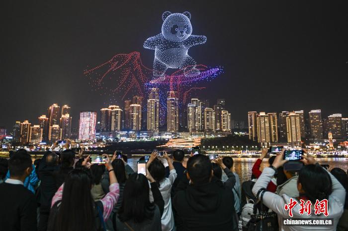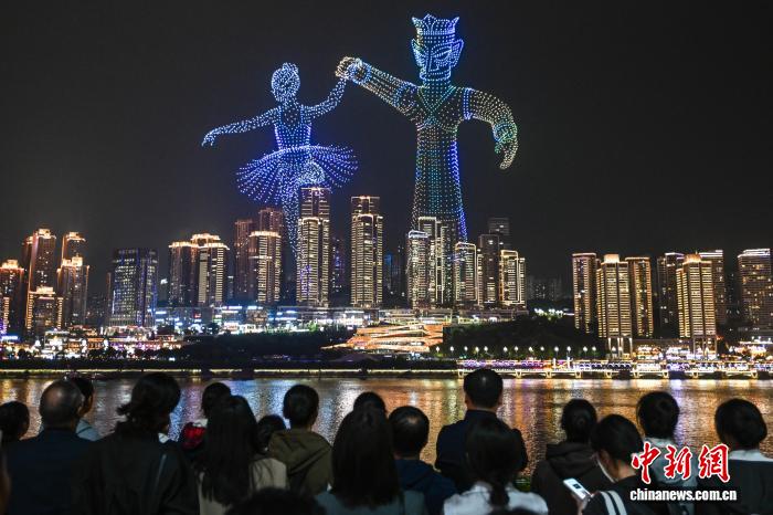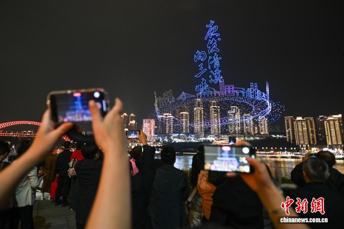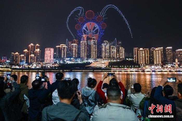 11月4日晚,“新韵重庆”无人机灯光秀第十四届中国艺术节闭幕式专场表演在重庆两江交汇的夜空璀璨上演。中新社记者 何蓬磊 摄