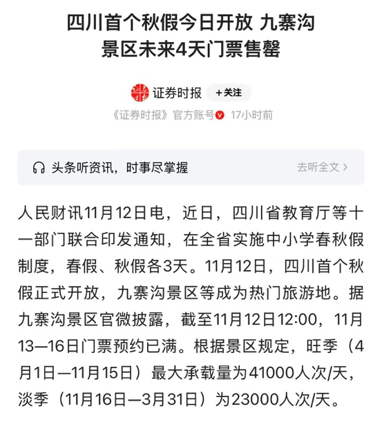 不止是上海迪士尼,这几天国内不少热门旅游目的地和景区都被秋假大军攻陷。九寨沟景区官方发布紧急预告,11月13日-16日的门票已经全部约满,每天涌入的游客量超过4万人次,诱发游客量暴涨的直接原因就是四川首个中小学秋假。