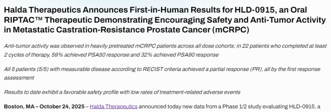 据悉,Therapeutics Halda拥有专有的调控诱导接近靶向嵌合体(RIPTAC)平台,用于开发针对多种实体瘤的口服靶向疗法。其中,主导候选药物HLD-0915目前正处于Ⅰ/Ⅱ期临床研究阶段,旨在克服转移性去势抵抗性前列腺癌(mCRPC)治疗中的耐药性。