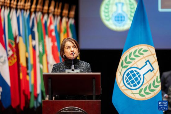 11月27日,在荷兰海牙,达拉菲奥尔被任命为禁化武组织总干事后发言。新华社发(禁化武组织供图)