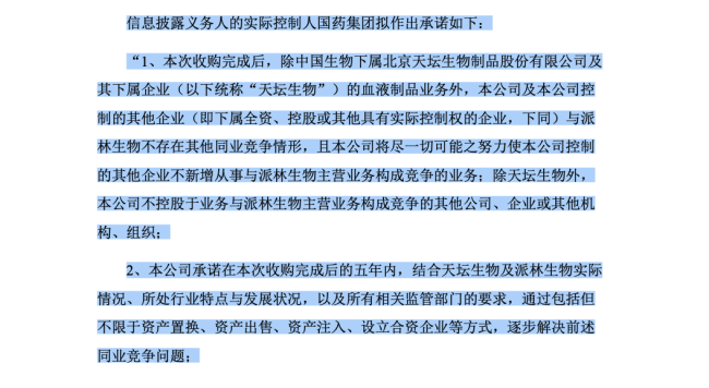 对此,国药集团及中国生物已承诺,在交易完成后五年内通过资产置换、注入或出售等方式逐步解决同业竞争。