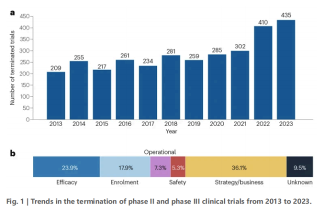 数据显示,全球II/III期临床试验的终止数量已从2013年的209项激增至2023年的435项,翻了一番。
