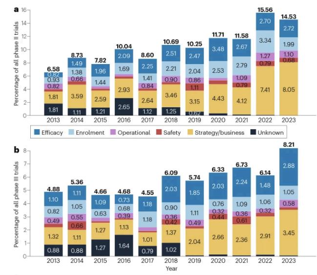 近期,Nature上发表的一篇报告显示,近十年来,全球II/III期临床试验的终止数量已从2013年的209项激增至2023年的435项,翻了一番,而战略与商业原因占比高达36.1%,这意味着,近年来MNC砍管线的举措,并非仅源于科学探索的受挫,而超过30%是为应对市场、资本与内部管线压力所进行的主动战略收缩。