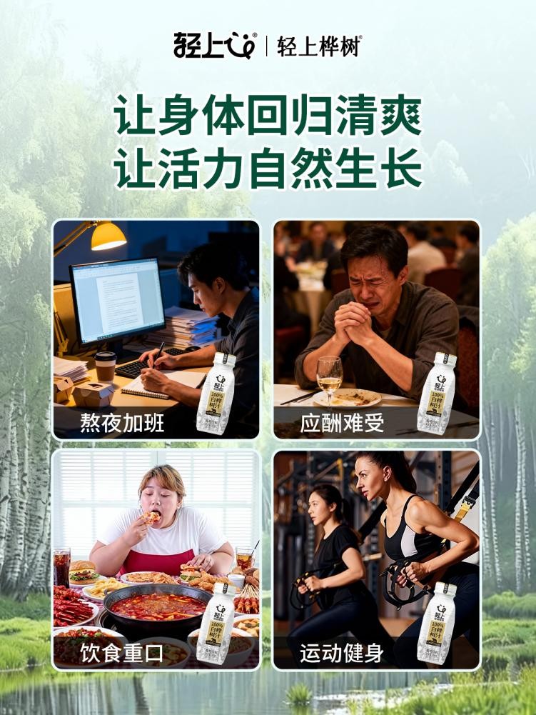 事实上,在健康升级的消费趋势下,消费者对饮品的需求早已超越单纯的解渴功能,转向"纯净成分+功能价值"的双重追求。白桦树汁作为从白桦树干上采集的"森林甘露",其天然、纯净的属性恰好契合了这一需求,而轻上通过技术创新与品质把控,将这种天然价值充分挖掘并呈现给消费者,成为其爆火的核心原因。在饮用场景上,轻上深度绑定"酒前酒后"的消费场景,将"酒前酒后,喝轻上白桦树汁"的理念植入消费者心智,使其成为商务应酬等场景下的健康饮品选择,进一步拓宽了产品的市场需求。