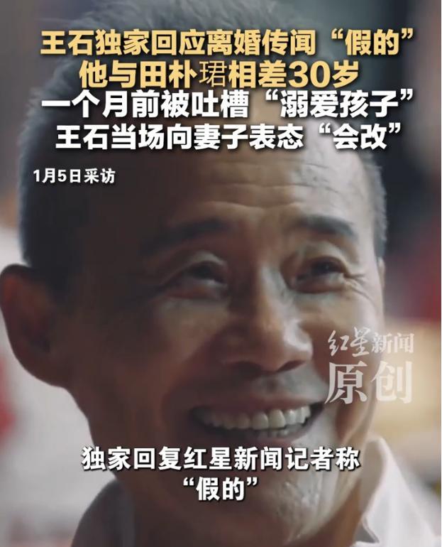 王石回应离婚传闻 再次辟谣!万科集团创始人王石针对网传“王石与田朴珺离婚”的说法,在1月5日晚回复红星新闻记者称这一消息是假的。几小时前,田朴珺也对记者做出了同样的回应,夫妻二人的说法完全一致。