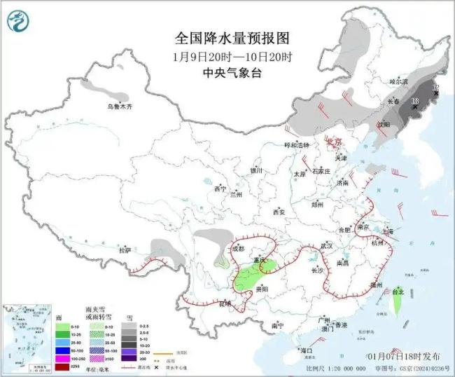 1月9日20时至10日20时,内蒙古中东部、东北地区中东部、黄淮东部、新疆沿天山地区、西藏东南部、川西高原北部等地部分地区有小雪或雨夹雪,其中,东北地区东部等地部分地区有中到大雪,黑龙江东南部、吉林东部等地局地暴雪。四川东南部、重庆南部、贵州北部、台湾岛中东部等地部分地区有小雨。内蒙古中部、辽宁中西部、山西、河北、北京西北部、山东等地部分地区有4~6级风,阵风7~8级。黄海南部海域将有6~8级、阵风9级的大风。