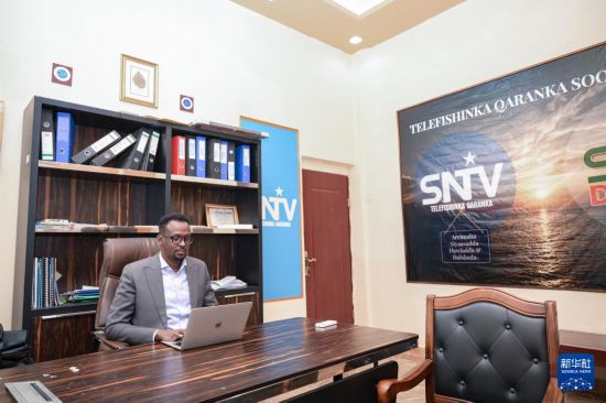1月12日,在索马里首都摩加迪沙的索马里国家电视台,台长穆罕默德·卡菲·谢赫·阿布卡尔在办公室工作。新华社记者 杨光 摄