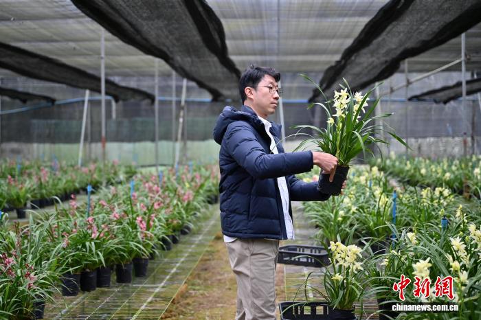 1月22日,赖昀辰在位于广州市的兰花基地挑选洋兰,准备发货。中新社记者 陈楚红 摄
