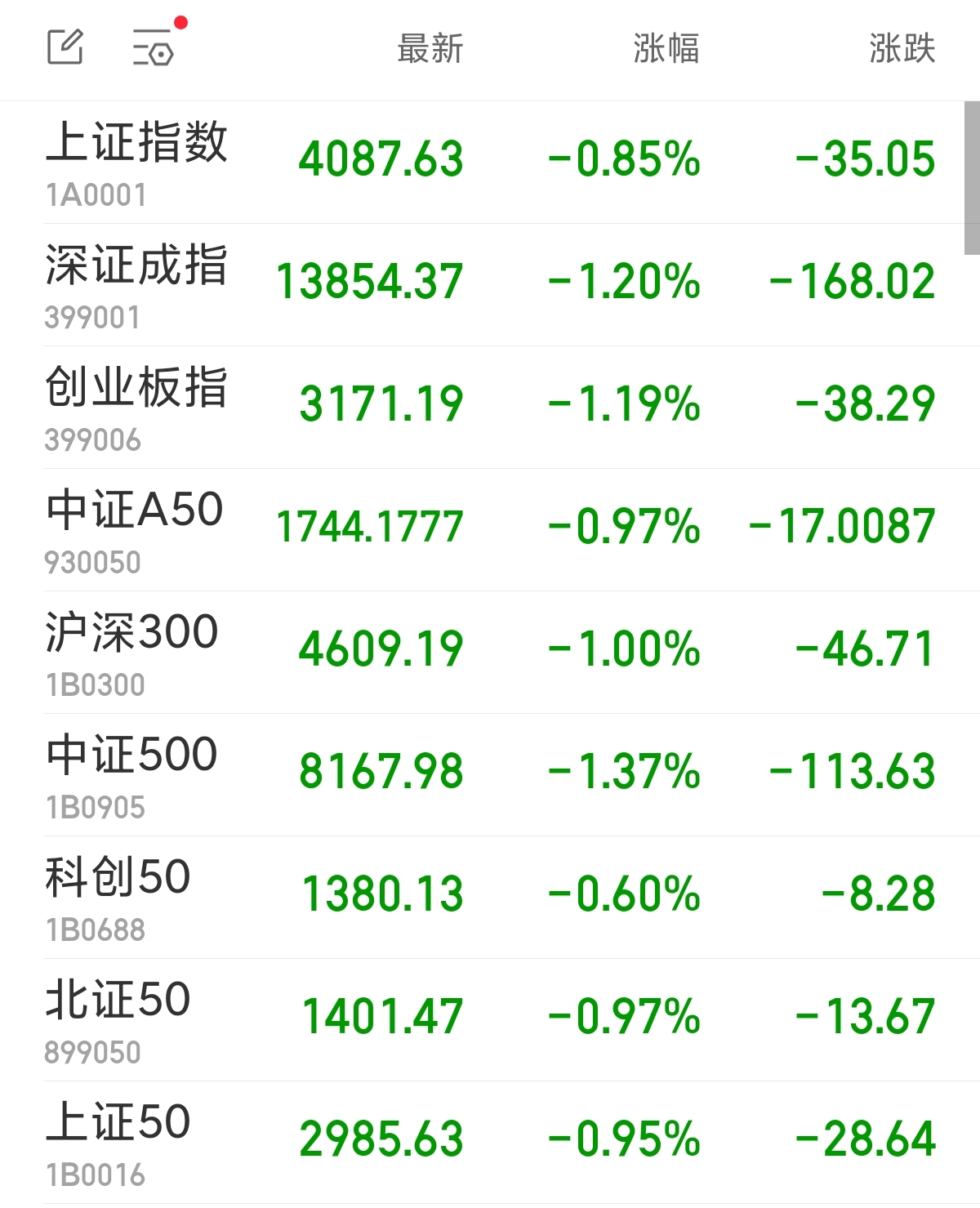 中新经纬3月4日电 周三,A股三大指数集体低开。上证指数跌0.85%,报4087.63点;深证成指跌1.20%,报13854.37点;创业板指跌1.19%,报3171.19点。
