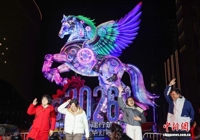 3月3日晚,江苏南京,充满科技感的飞马彩灯吸引民众驻足欣赏。中新社记者 泱波 摄