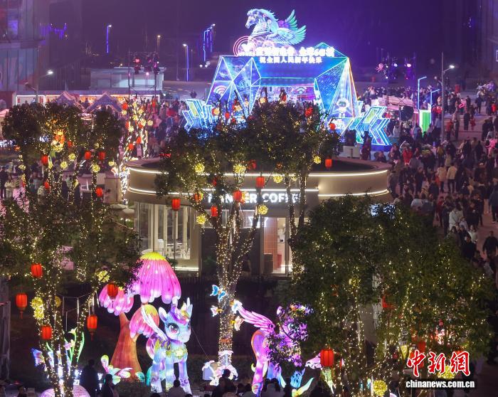 3月3日晚,江苏南京,点亮的飞马彩灯吸引民众驻足欣赏。中新社记者 泱波 摄