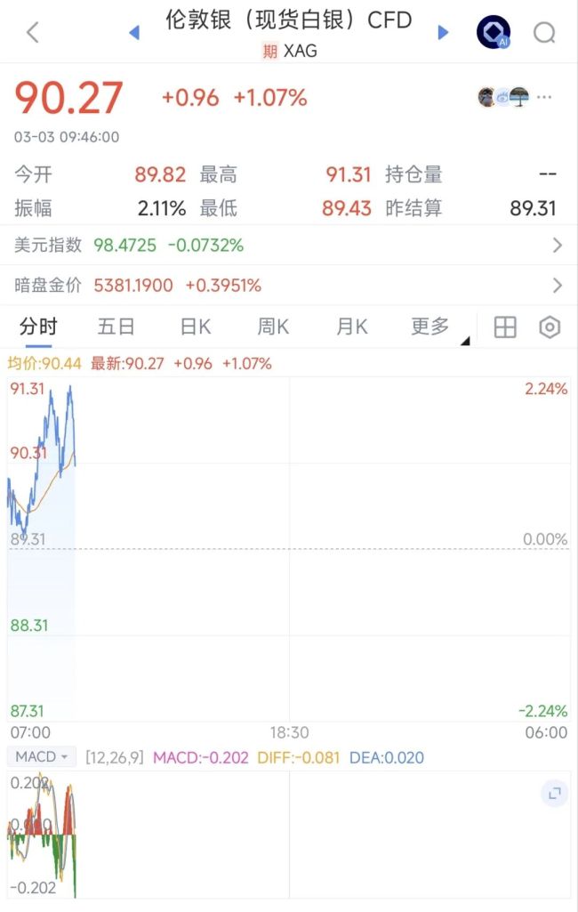 3月3日,现货金银周二高开反弹,截至发稿,现货黄金涨0.81%报5364.83美元/盎司,现货白银反弹,日内涨幅扩大至1.07%左右,报90.27美元/盎司。