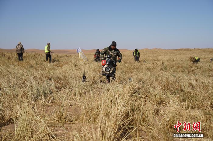 走进获各琦苏木境内的本巴图沙漠项目区,治沙工人正俯身将一束束稻草均匀铺展在沙地上。随着机械的轰鸣声响起,稻草被深深压入沙中,仅留半截挺立地表。横竖交错、规整有序的草方格在沙丘上连绵延伸,为茫茫黄沙织起了一道道防护网。