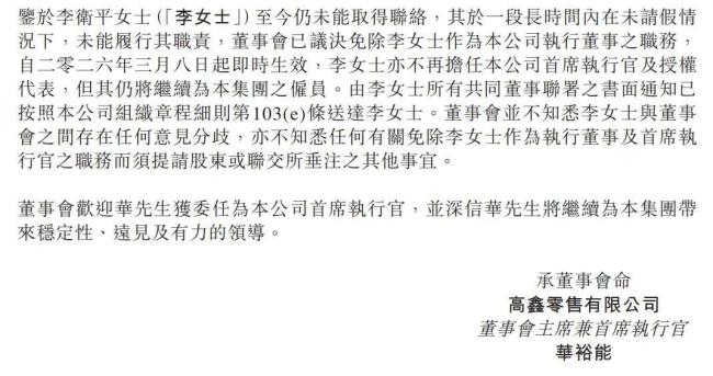3月8日,高鑫零售发布公告称,由于李卫平女士长时间未请假且未能履行职责,董事会决定免除其执行董事职务,自3月8日起生效。同时,董事会主席华裕能被任命为公司首席执行官、执行董事及授权代表,同样自3月8日起生效。尽管李卫平不再担任首席执行官和授权代表,但她仍将是集团的雇员。