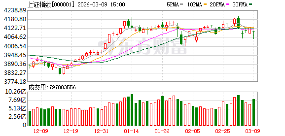 3月9日,市场全天探底回升,三大指数跌幅明显收窄。截至收盘,沪指跌0.67%,深成指跌0.74%,创业板指跌0.64%。算力租赁概念快速拉升,电力板块表现活跃,电网设备概念逆势走强。港口航运概念集体下挫,油气概念高开低走。全市场超3900只个股下跌,沪深两市成交额2.65万亿元,较上一个交易日放量4474亿。