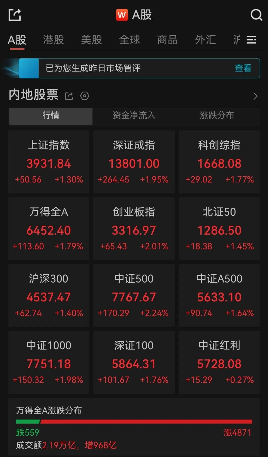 全市成交额2.19万亿,超4800只个股上涨。