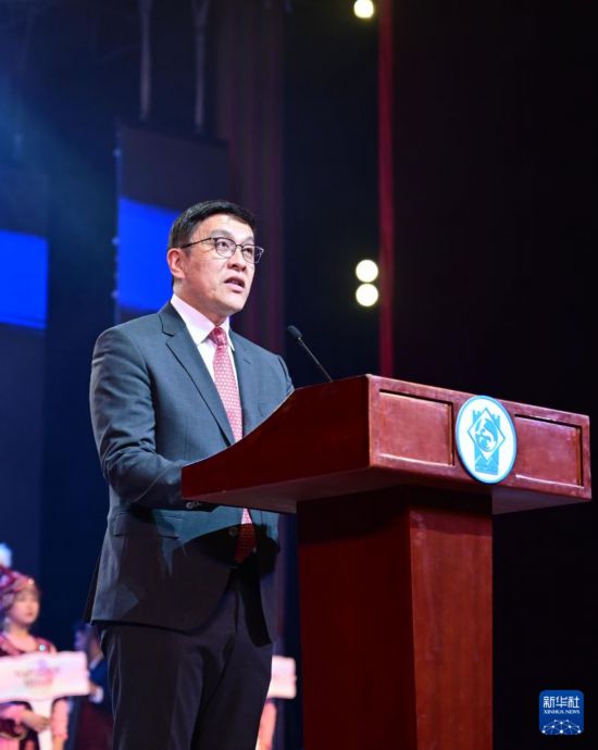 3月24日,在吉尔吉斯斯坦首都比什凯克,比什凯克市市长朱努沙利耶夫在开幕式上致辞。新华社记者 李任滋 摄