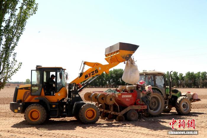 农户为加装北斗导航系统的大型播种机添加薯种。马爱彬 摄