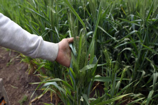2022年3月14日,农民在埃及盖勒尤卜省的农田中展示麦穗。新华社发(艾哈迈德·戈马摄)