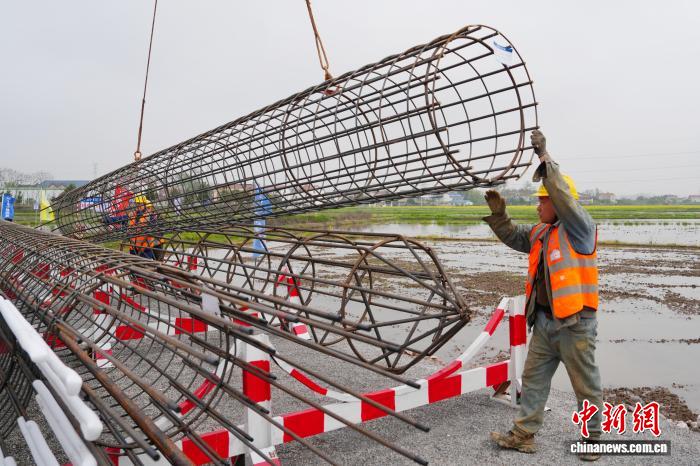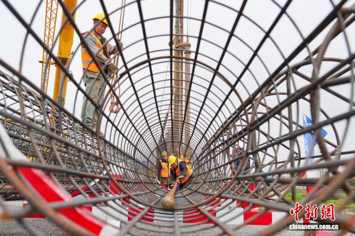 图为工人进行桩基钢筋笼吊装作业。中新社记者 杨华峰 摄