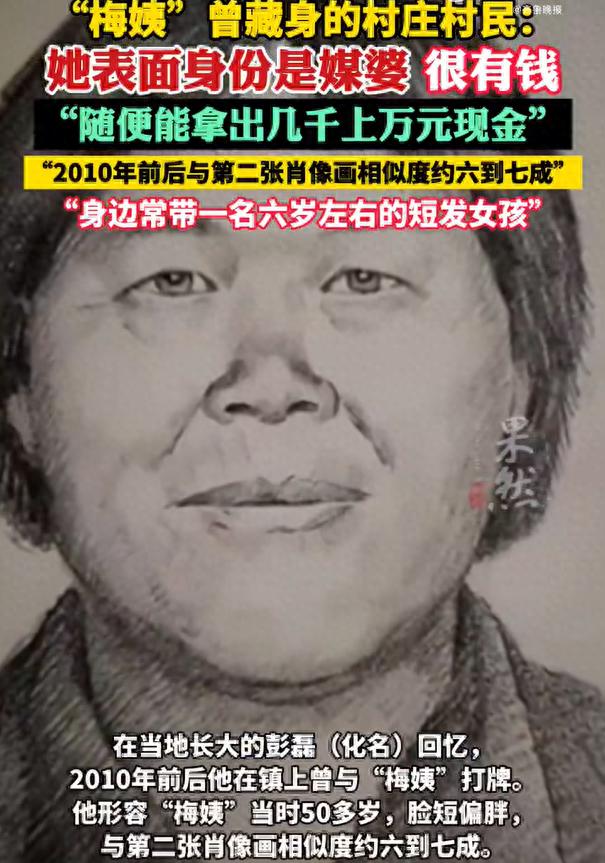3月25日,记者在广东省河源市紫金县水墩镇黄砂村找到彭老汉住处,但家中无人,邻居称其已数日未归。多位村民回忆见过“梅姨”。一名60岁左右村民回忆,“梅姨”自称姓潘,经人介绍与丧偶的彭老汉同居,表面身份是做媒婆,曾带一名小孩来村,来去不定,最长住一两个月。在当地长大的彭磊(化名)回忆,2010年前后他在镇上曾与“梅姨”打牌。“她衣着比乡下同龄人时髦,身边常带着一名六岁左右的短发小女孩。”