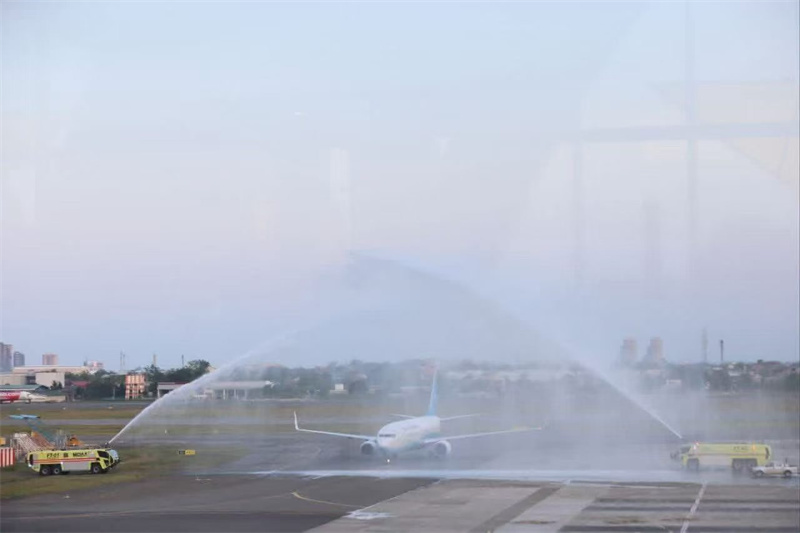 宿务麦克坦国际机场以“过水门”仪式欢迎厦航MF8695航班顺利复航。 厦门航空马尼拉办事处供图
