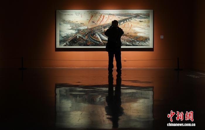 4月1日,湖北武汉,观众参观展出的国画作品《南北天堑变通途》。 中新社记者 张畅 摄