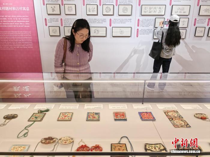 观众参观展出的各色荷包。中新网记者 钟升 摄