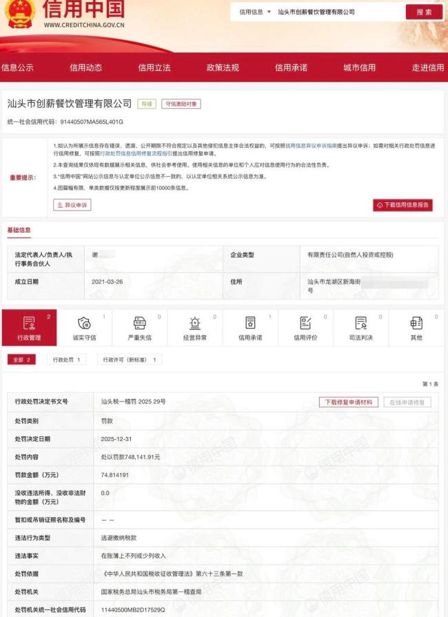 1月6日,广东汕头一家名为“创新土鸡”的网红餐饮店(主体为汕头市创薪餐饮管理有限公司)因逃避缴纳税款被税务部门处以74.81万元罚款,此事引发了广泛关注