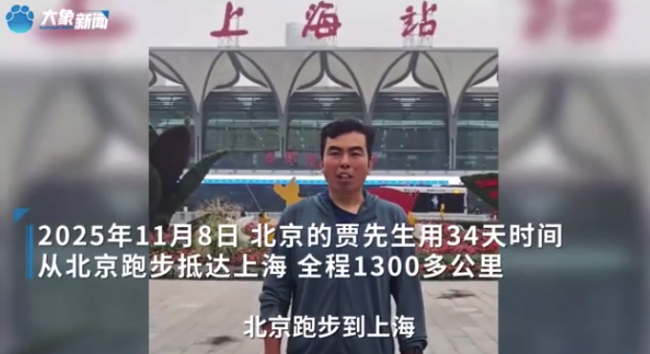 2025年11月8日,来自北京的跑步爱好者贾先生发视频称,自己用34天时间从北京跑步抵达上海,全程1300多公里。贾先生说,他每天跑三四十公里左右,全程跑坏了5双鞋,总花费8000多元。他曾完成北京跑步去天津、衡水、郑州等挑战。贾先生还说,...