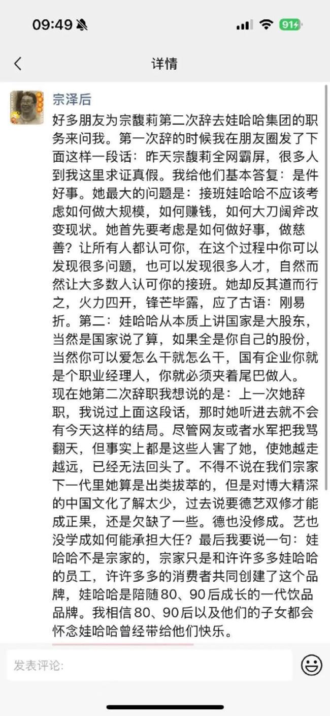 10月10日,宗馥莉向娃哈哈集团有限公司辞去了董事长等相关职务,并已通过集团股东会和董事会的相关程序。10月11日,宗馥莉的叔叔宗泽后在朋友圈回应了关于宗馥莉第二次辞职的消息。他表示,许多人询问他关于此事的看法