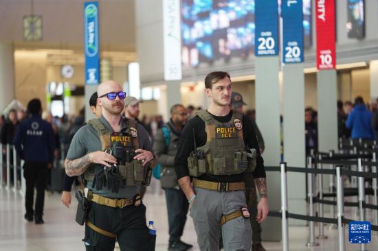 3月23日,移民与海关执法局的执法人员在美国纽约拉瓜迪亚机场的出发安检处执勤。 随着美国土安全部及其下属机构持续“停摆”,全美机场安检系统受到明显影响。美国总统特朗普决定,从23日开始向美国机场